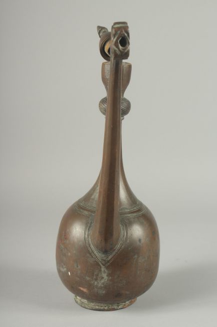 AN 18TH CENTURY PERSIAN SAFAVID COPPER EWER, the handle and spout with dragon head terminals, 38cm high.