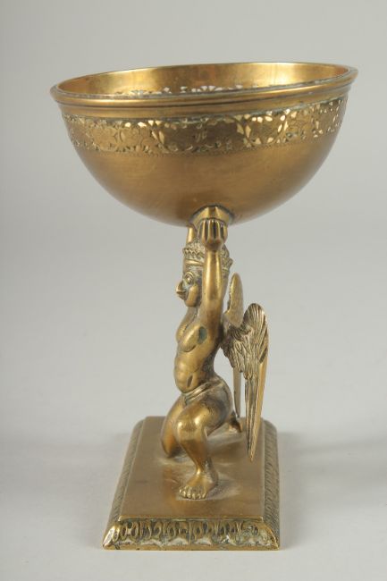 A FINE 19TH CENTURY INDIAN BRASS OFFERING BOWL WITH A GARUDA BASE, 17.5cm high.