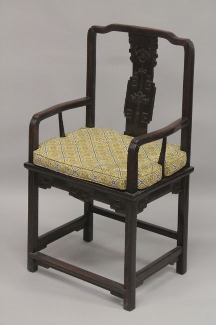 A GOOD 19TH CENTURY CHINESE REDWOOD ARMCHAIR, with curving top rail, carved central splat, solid seat above a carved frieze supported on stretchered square legs.