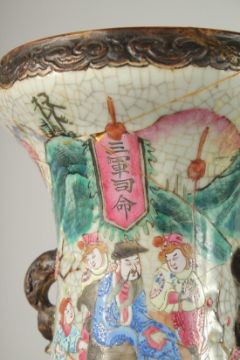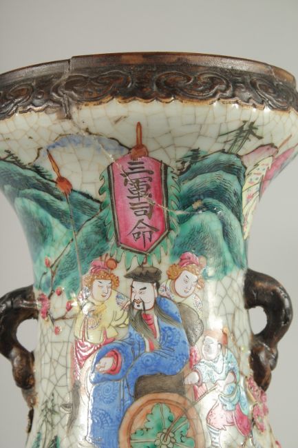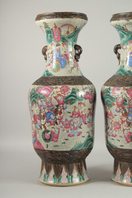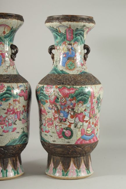 A LARGE PAIR OF CHINESE FAMILLE ROSE PORCELAIN VASES, with moulded twin handles, each painted with a procession of figures on horseback, each with character mark to base, (af), 61cm high.