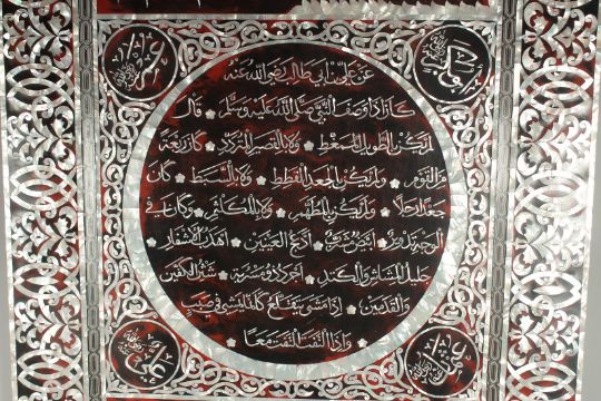 A VERY LARGE ISLAMIC MOTHER OF PEARL INLAID WOODEN HILYA PANEL, 110cm x 68cm.