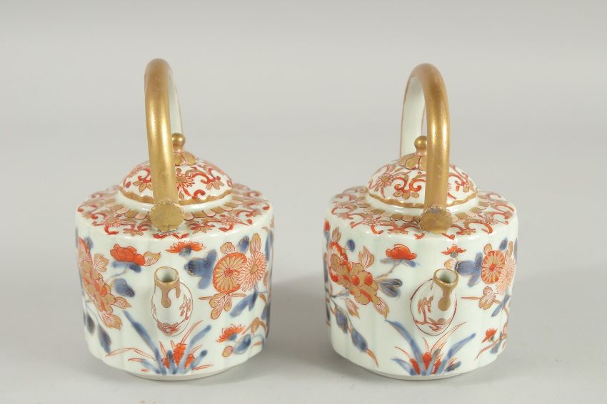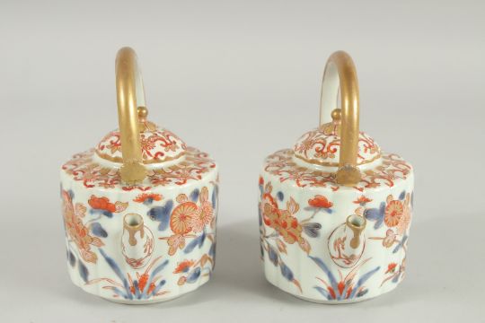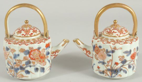A FINE PAIR OF JAPANESE IMARI PORCELAIN TEAPOTS, painted in the typical Imari palette with blue, red and gilt floral decoration, 14cm high.