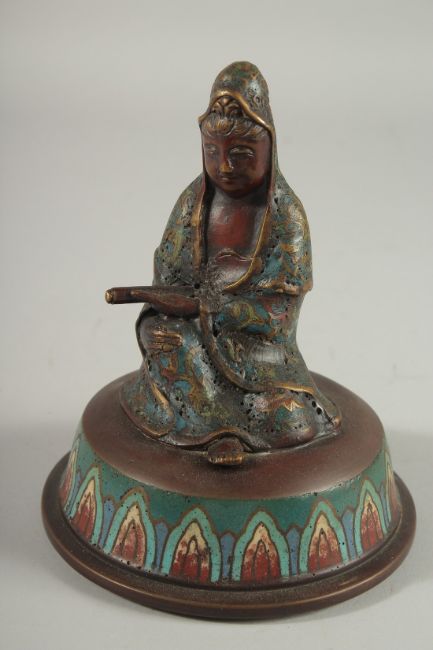 A LARGE CHINESE CLOISONNE ENAMELLED BRONZE JAR AND COVER, with figure of Guanyin to the cover, the jar with drop ring handles and elevated on three legs united with a circular base, beautifully enamelled with floral motifs, 48cm high.