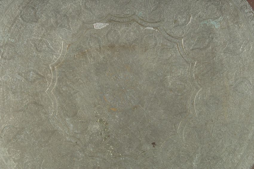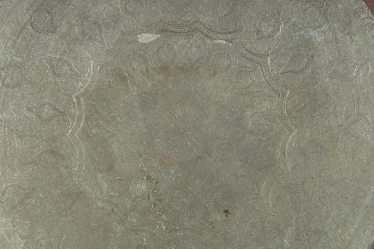 A VERY LARGE ISLAMIC ENGRAVED TINNED COPPER TRAY, 78cm diameter.