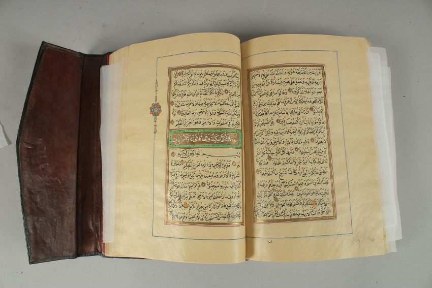 A 19TH CENTURY OTTOMAN TURKISH QURAN, signed Hafiz Uthman al-Fawzi and dated 1258H./1842, fifteen lines of text per page in Naskhi script in black ink. Surah titles inscribed in white ink in gilded rectangular cartouches and delineated by a brightly coloured band, gilt circles punctuated by polychromy separating the verses, marginal medallions in the form of finials, mandorlas or rosettes illuminated in gold and polychromy and indicating the section numbers in white ink, flap binding in embossed and gilded black leather in the centre of a medallion and two half-medallions on either side decorated with vegetal scrolls with rosettes and saz leaves. Border painted with foliage, solid red paint on the inner plates,19.8 x 12.5 cm.