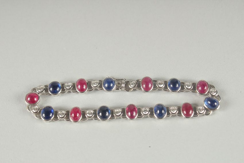 A VERY GOOD 18CT WHITE GOLD RUBY, SAPPHIRE AND DIAMOND LINE BRACELET.