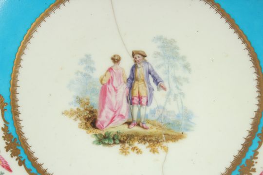 A PAIR OF 18TH CENTURY SEVRES CIRCULAR PORCELAIN PLATES, the blue borders