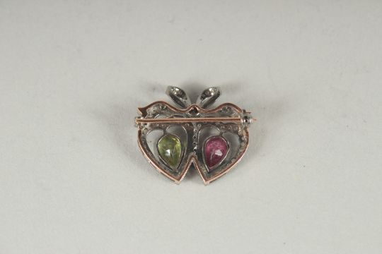 A GOLD AND SILVER DIAMOND & PEARL DOUBLE HEART BROOCH.