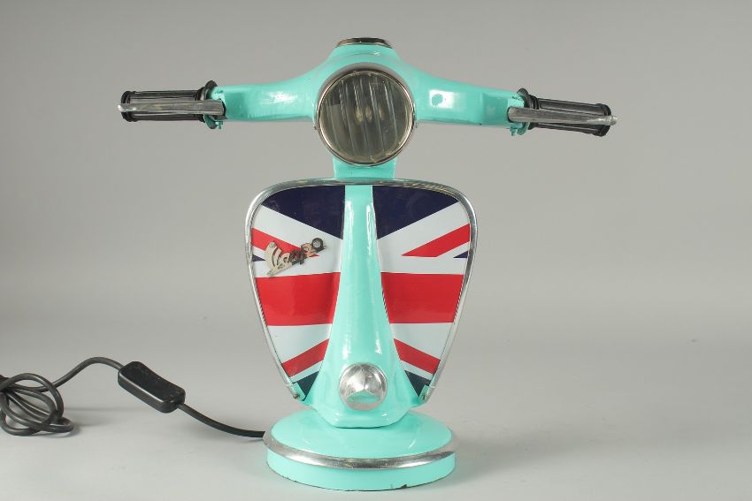 A GREEN UNION JACK VESPA LAMP. 13ins high.
