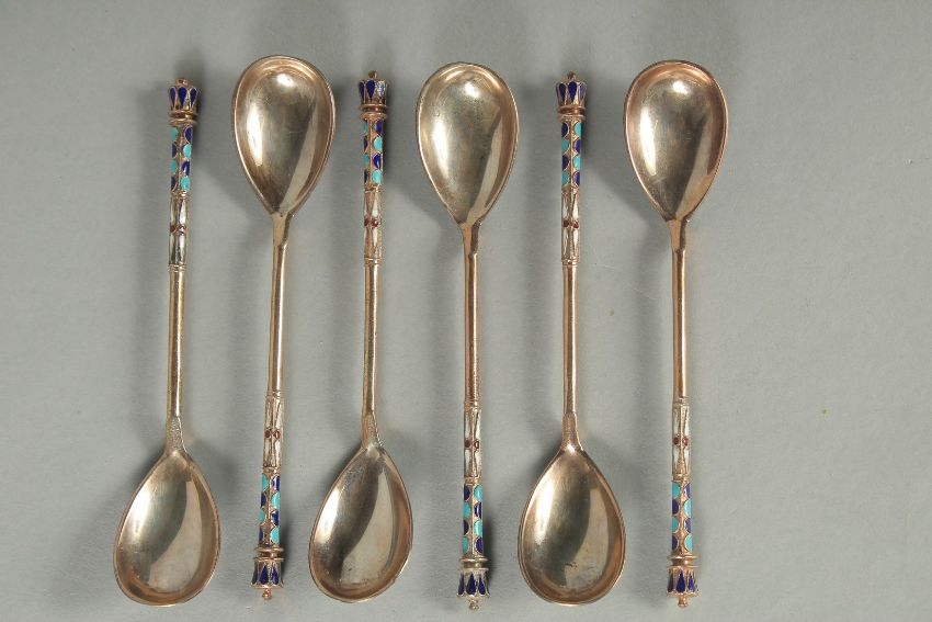 A SET OF SIX RUSSIAN SILVER AND ENAMEL SPOONS.