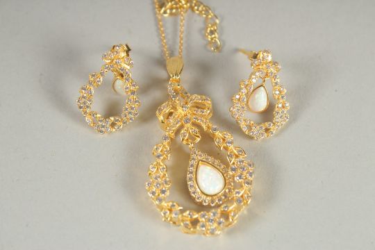 A PAIR OF SILVER, GOLD PLATED OPAL SET EARRINGS AND PENDANT AND CHAIN.