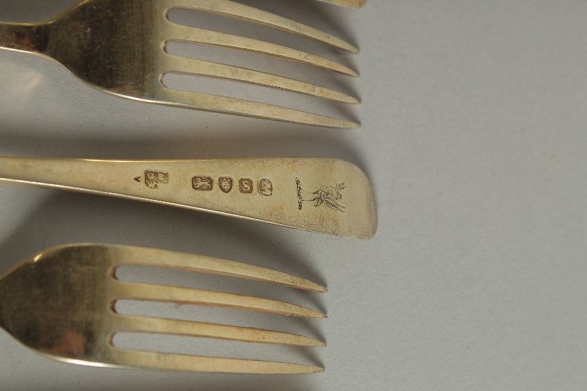A GOOD SET OF 24 GEORGE III SILVER GILT FEATHER EDGE DESSERT FORKS.
