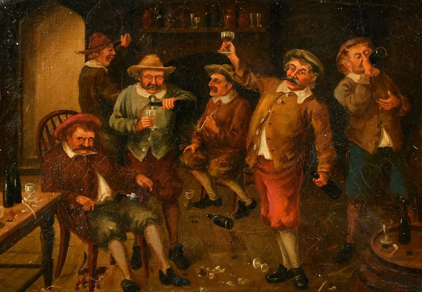 Manner of David Wilkie, gentlemen making merry in a tavern, oil on canvas, dated 1882, 10" x 14" (25 x 36cm).