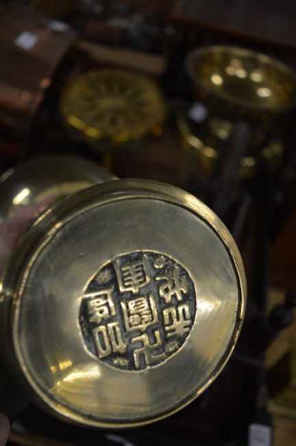 Miscellaneous collectables to include brass stands, miniature spinning wheel, copper coal scuttle, Chinese brass vase etc.