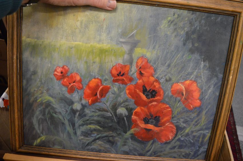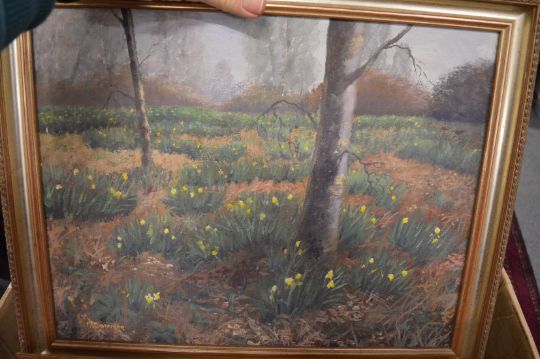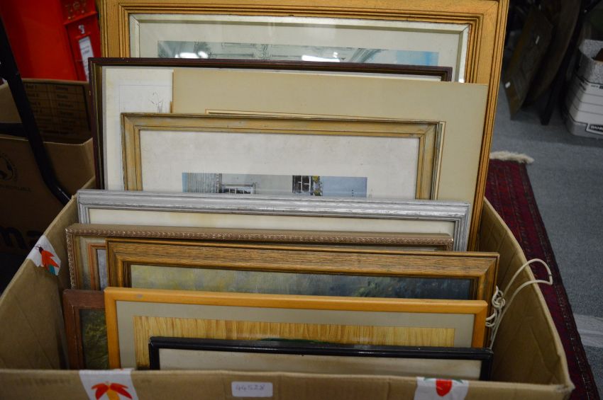A box of paintings and prints.