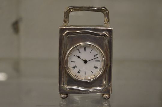 A small silver carriage type clock.
