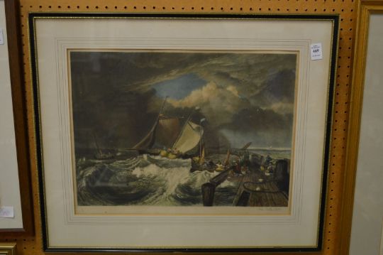 Fishing dinghies in a choppy sea, colour print, pencil signed.