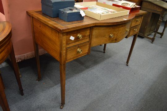 An Edwardian inlaid rosewood writing desk with bow fronted central drawer flanked by four small drawers on tapering legs.