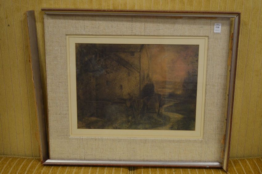 Watermill by a path, watercolour and charcoal.
