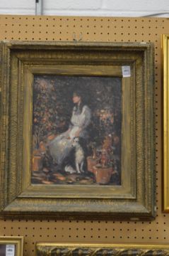 A young lady seated with a dog, oil on board in a decorative gilt frame.