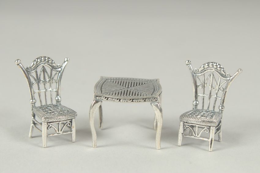 A miniature silver table and two chairs.