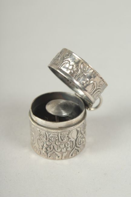 A silver circular thimble case, 2.5cm.