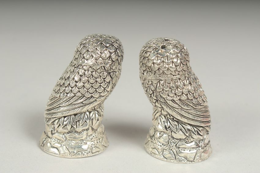 A pair of silver plated owl salt and peppers with yellow eyes.