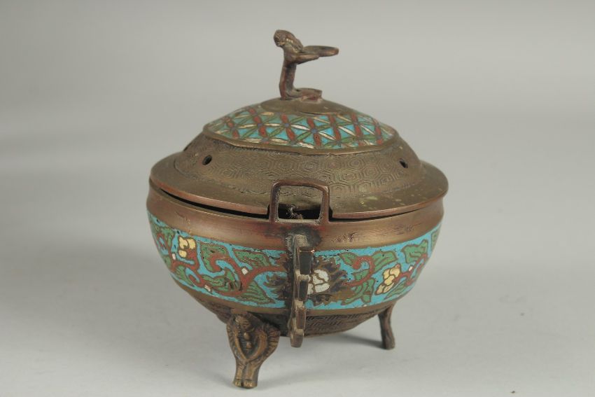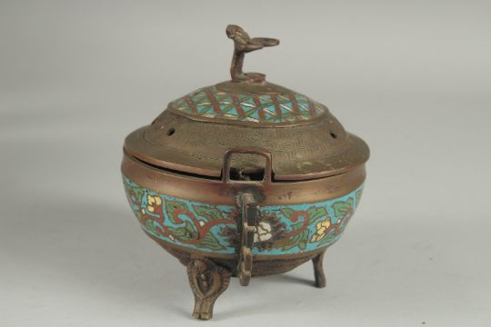 A CHINESE CHAMPLEVE ENAMEL CLOISONNE CENSER AND COVER, raised on tripod legs, 15cm high.
