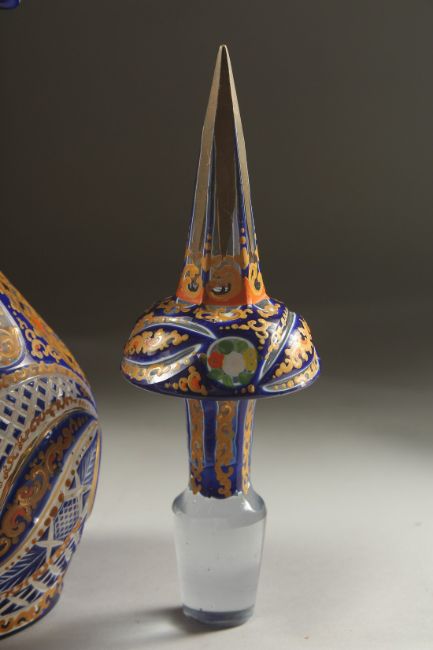 A 19TH CENTURY ISLAMIC, OTTOMAN MARKET, ENAMEL OVERLAID BOHEMIAN GLASS JUG DECANTER AND STOPPER, 29.5cm high.
