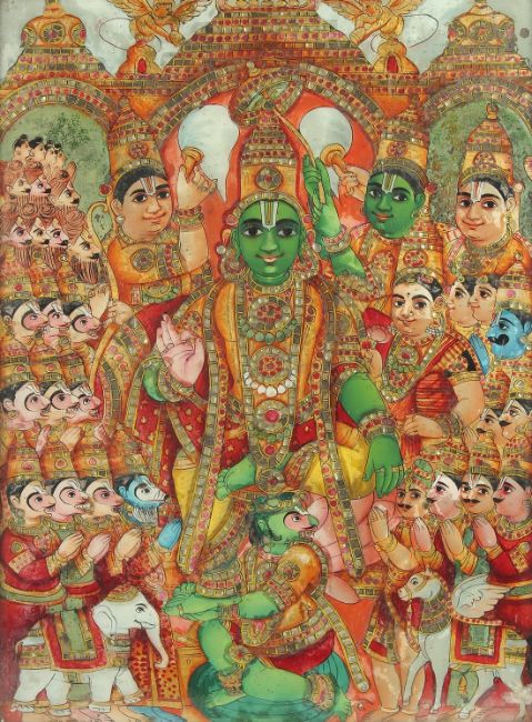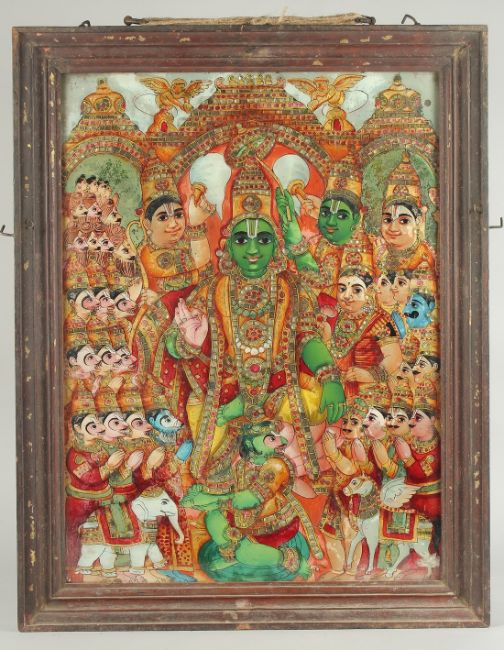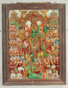 A LARGE LATE 19TH CENTURY SOUTH INDIAN TANJORE REVERSE GLASS PAINTING depicting the coronation of Rama, 70cm x 55cm overall.