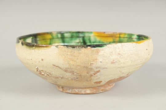 A 9TH-10TH CENTURY PERSIAN SPLASH WARE GLAZED POTTERY BOWL, 18cm diameter.
