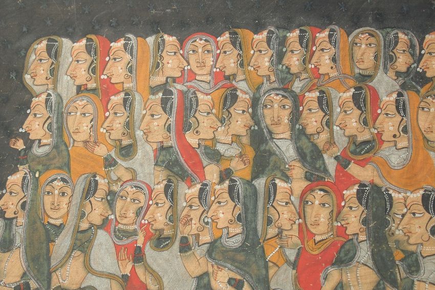 A VERY LARGE 19TH / EARLY 20TH CENTURY FRAMED INDIAN PAINTED TEXTILE, depicting Krishna amongst gopis, framed - unglazed, 90cm x 152.5cm overall.