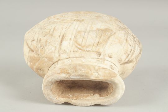 A RARE 11TH - 12TH CENTURY POSSIBLY ANDLUSIAN ALMOHAD SPANISH CARVED WHITE MARBLE FOOTED BOWL, 19.5cm wide.