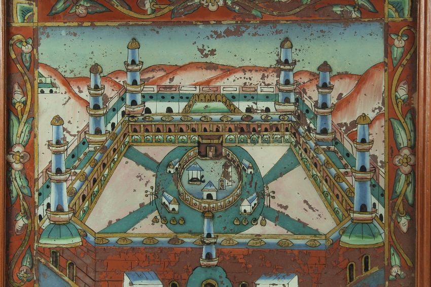 AN INDIAN OR MIDDLE EASTERN REVERSE GLASS PAINTING OF KA'BA AND THE MASJID AL-HARAM IN MECCA ( Kabba), Circa 1900, image 44.5cm x 54cm.