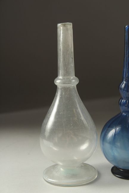 A COLLECTION OF THREE 18TH CENTURY MUGHAL INDIAN GLASS ROSEWATER SPRINKLERS, tallest 22cm high (3).