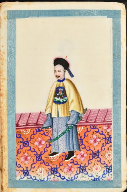A SMALL FOLIO OF EIGHT 19TH CENTURY CHINESE WATERCOLOUR ON PITH PAPER PAINTINGS of noble figures in robes, each 7.25" x 4.25" (18.5 x 11cm), (8).