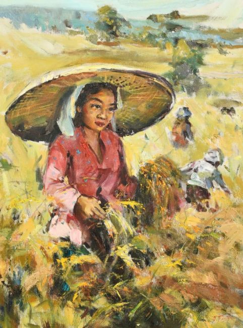 I. FANTZE / FANTJE (1931-2002) INDONESIAN, female figures harvesting in a field, oil on canvas, signed, labels verso, 22" x 17" (56 x 43cm).