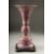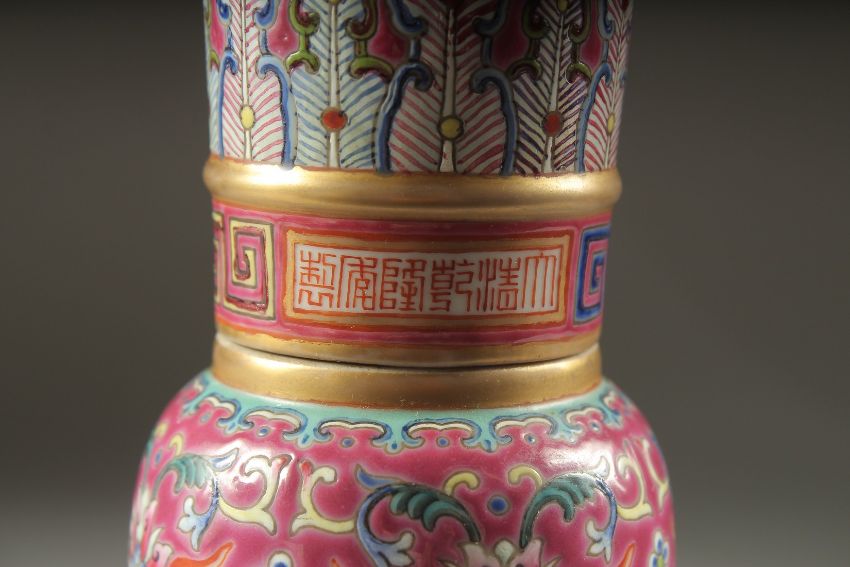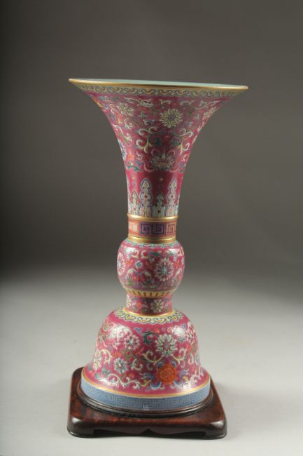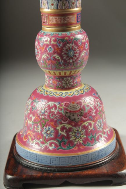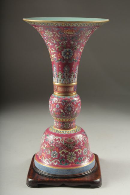 A CHINESE PINK GROUND FAMILLE ROSE PORCELAIN SECTIONAL GU VASE, and fitted hardwood stand, bearing Qianlong mark, painted with floral motifs and auspicious symbols, the inner rim and base with turquoise glaze, vase in two parts with detachable neck, vase 29.5cm high.