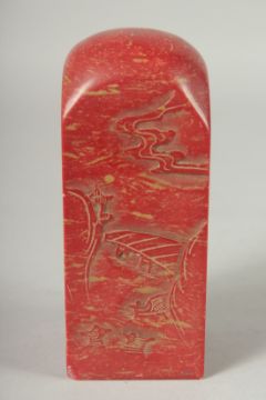 A LARGE CHINESE CARVED RED HARDSTONE SEAL, 15cm high.