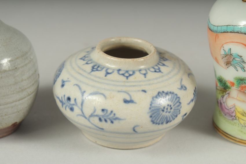 FOUR CHINESE MINIATURE POTTERY PIECES, including a small Hoi An Hoard shipwreck cargo pot, a famille verte vase, a studio pottery vase, and blue and white jar and cover, (4).