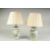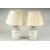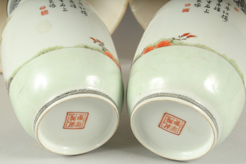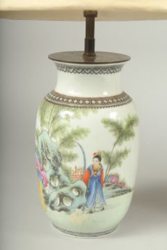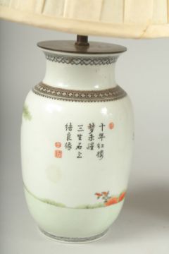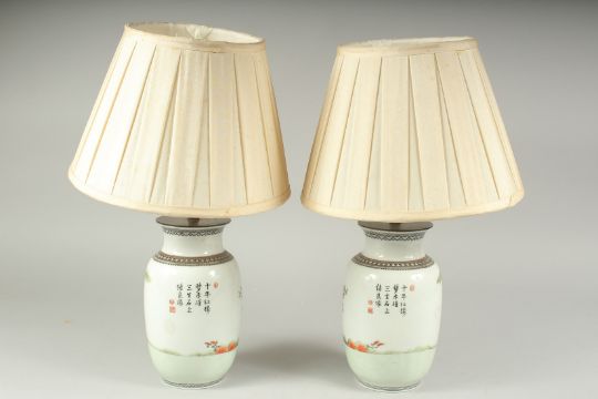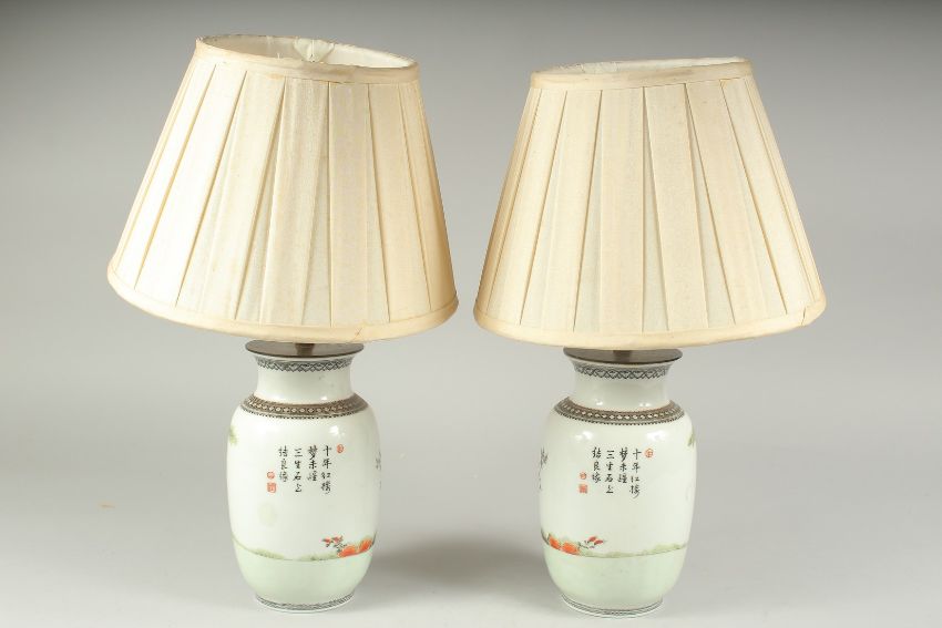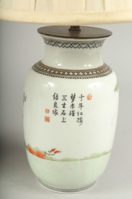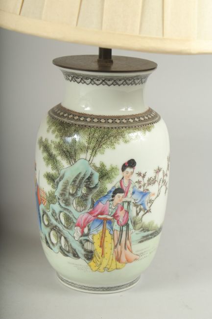 A PAIR OF CHINESE FAMILLE ROSE PORCELAIN VASE LAMPS, each painted with figures in a garden and inscribed with red marks, the base of each with red four-character mark, vases 19.5cm high (excl. lamp / shade).
