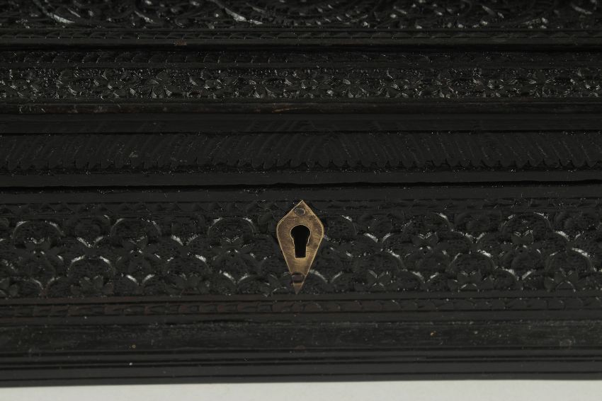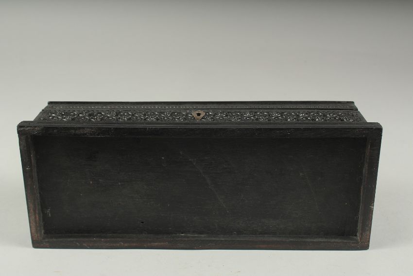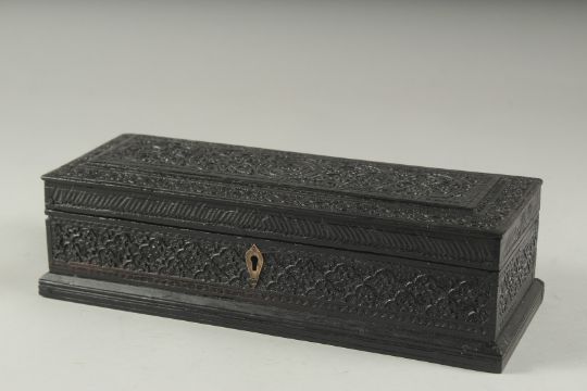 A FINE MID 19TH CENTURY ANGLO INDIAN CARVED EBONY BOX, 39.5cm x 11.5cm.