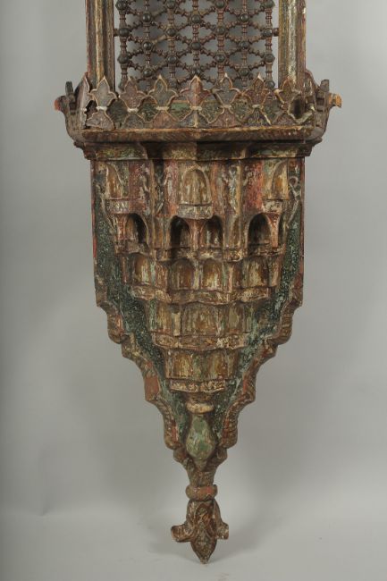A 18TH CENTURY MOROCCAN POLYCHROME PAINTED WOODEN KAVUKLUK / TURBAN STAND, 160cm high.