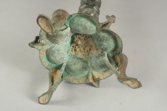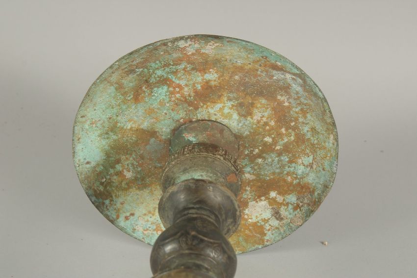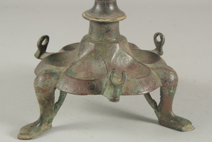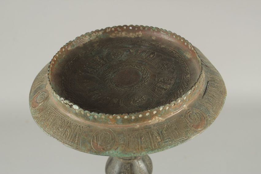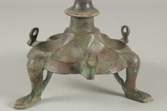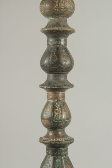 A 13TH CENTURY PERSIAN SELJUK PROBABLY KHURASAN BRONZE OIL LAMP STAND, with engraved decoration, the footed base with bull head terminals, 53cm high.