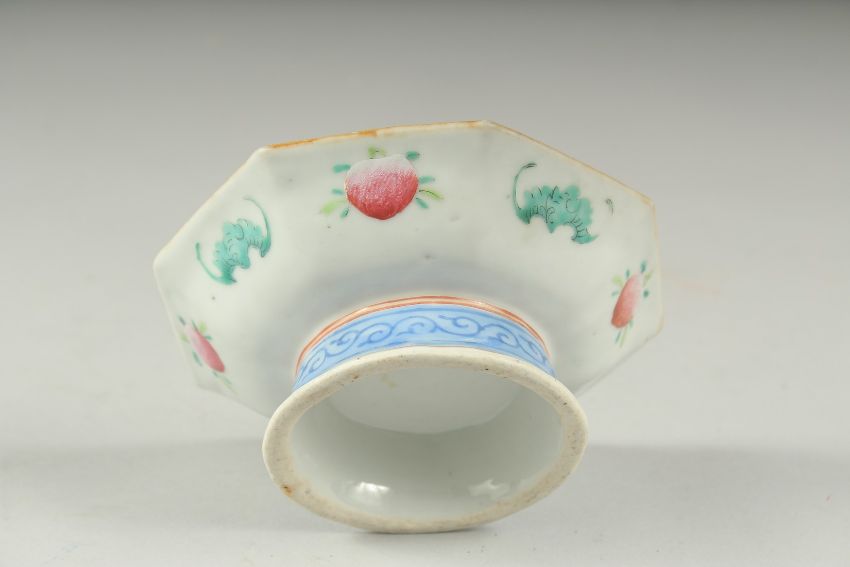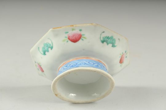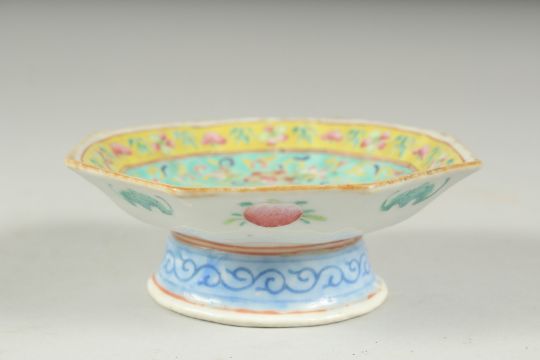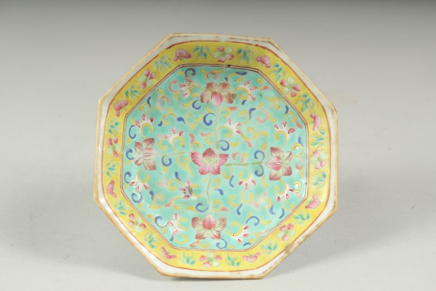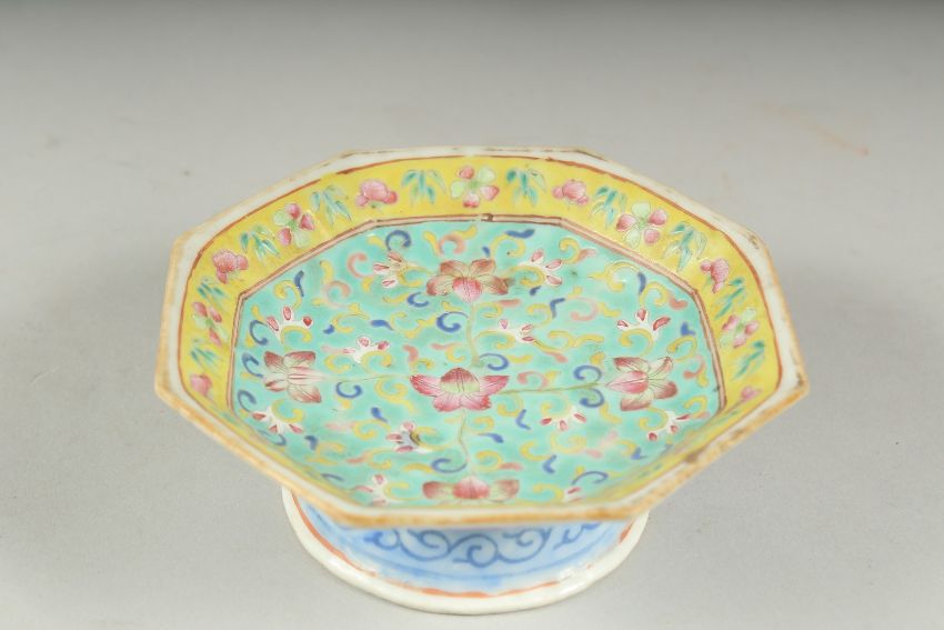 A SMALL CHINESE TURQUOISE GROUND FAMILLE ROSE FOOTED DISH, 13cm wide.