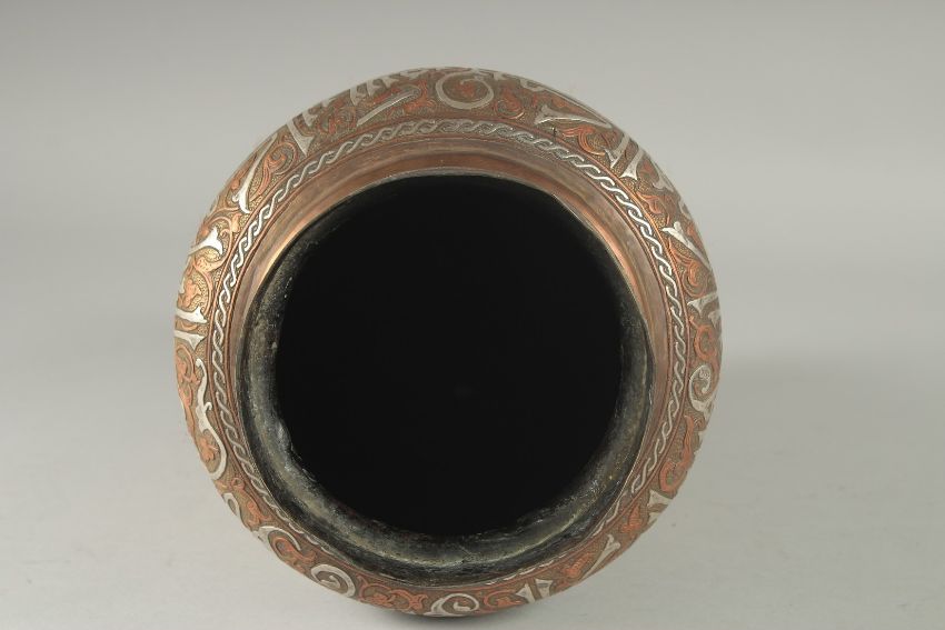 AN EYGPTIAN OR SYRIAN SILVER AND COPPER INLAID BRASS VASE, the shoulder with calligraphic band, the body with various decorative intertwining motifs, 36cm high.