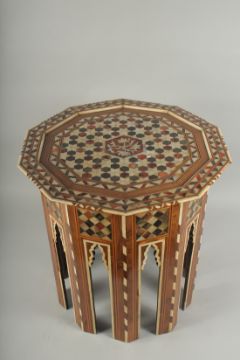 A FINE LATE 18TH CENTURY OTTOMAN TURKISH BONE, HORN, MOTHER OF PEARL AND TORTIOSESHELL TABLE, top 51cm wide, 51cm high.