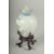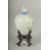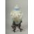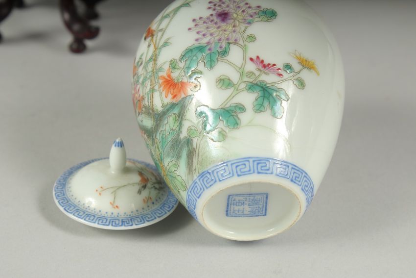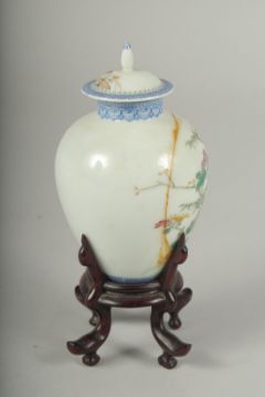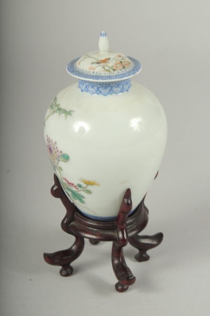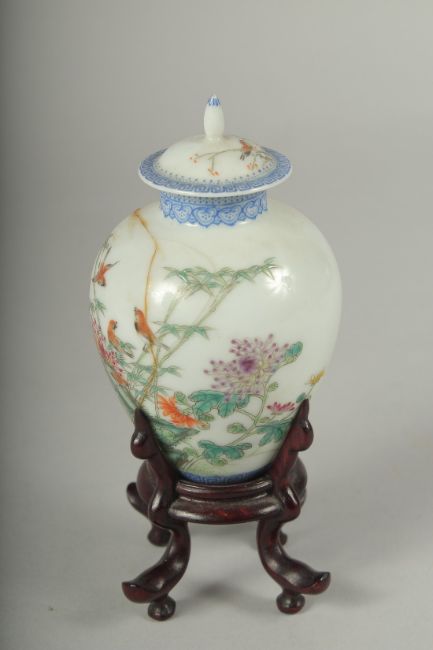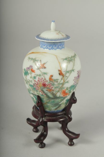 A SMALL CHINESE REPUBLIC PERIOD PORCELAIN JAR AND COVER, on a fitted wooden stand, painted with birds and flora, with mark to base, (af) jar and cover 11cm high.