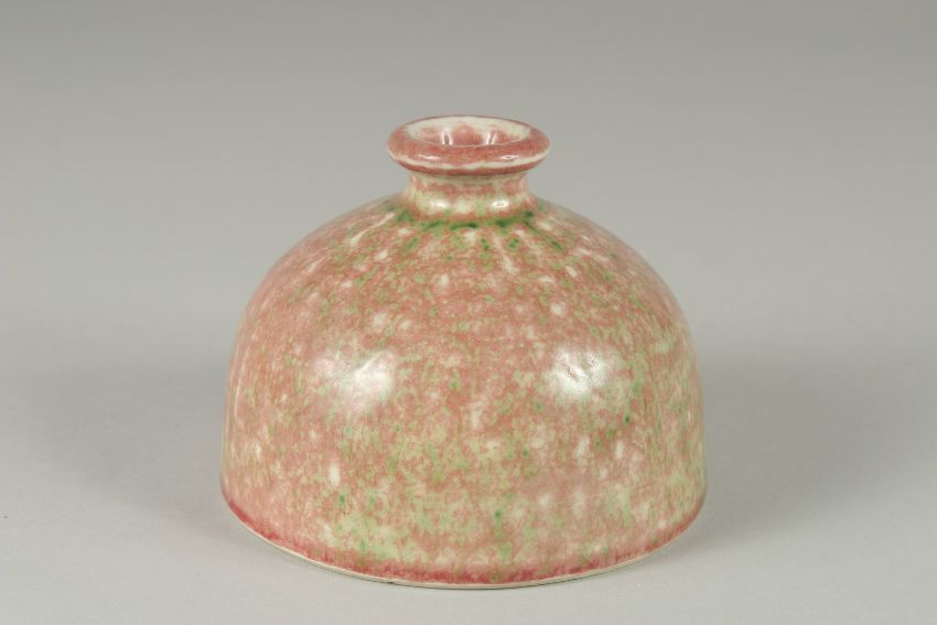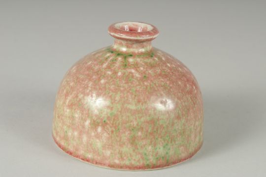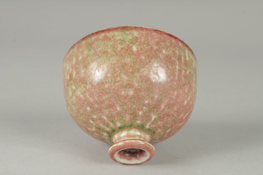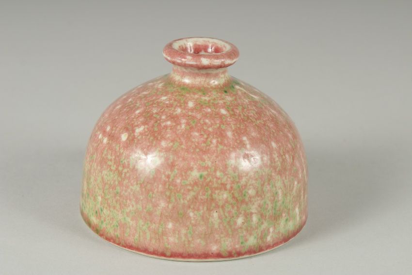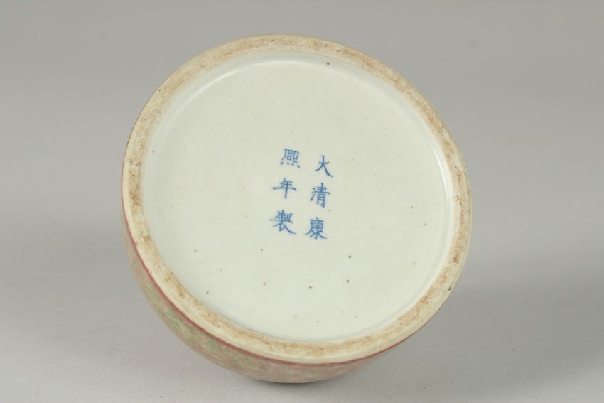 A CHINESE PEACH BLOOM PORCELAIN BRUSH WASHER bearing Kangxi marks to base, of graduated colour, 11.5cm diameter.