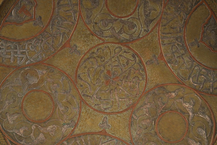 A CAIROWARE SILVER AND COPPER INLAID BRASS TRAY, 34cm diameter.
